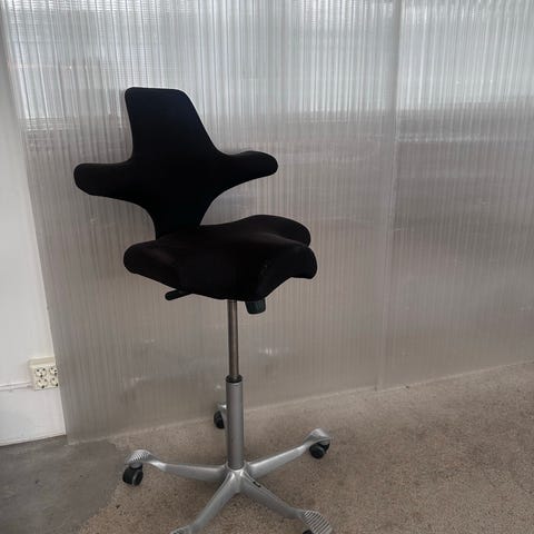 Säljer min Håg Capisco 8106 (svart läder). Inget fel på stolen, den är i fint skick. Den var bara inte rätt för mig. Inkluderar en extra liftomat (pistongen mellan hjulbasen och sätet) som är 265 mm lång, vilket är bra för långa personer eller för den som vill ha en "ståstol". Den liftomat som är monterad är 200 mm lång.