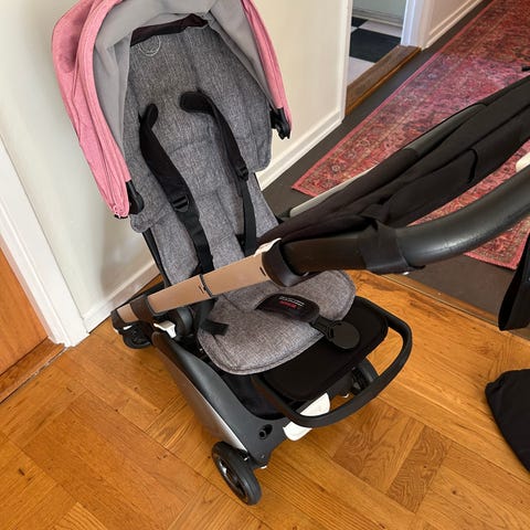 Beemoo sulky barnvagn i kompakt modell. Sittdelen är svart med justerbart ryggstöd och bälte. Vagnen har avtagbar frontbygel och sufflett i beige ton som ger sol- och vindskydd. Chassit har fyra hjul och körhandtag i bygelmodell. Passar som vardagsvagn eller resevagn för ett barn som kan sitta själv.