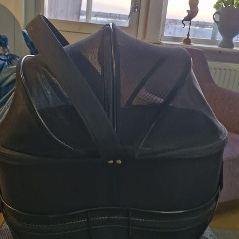 Genomskinligt nät runt hela väskan så man ser ut. Både axelrem och handtag. Fårskinns immitation på botten.