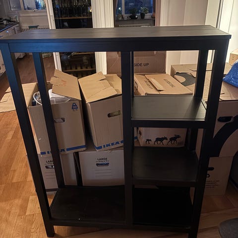 Vittsjö hylla / avlastningsbord från ikea den är mörkbrun och svart.