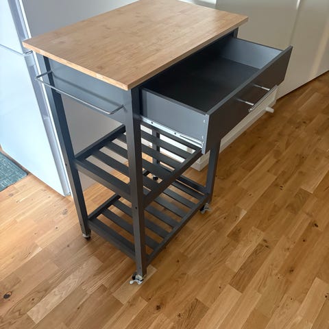 IKEA Vadholma köksö svart med massiv träskiva, ett utdragbart skåp och två hyllplan.