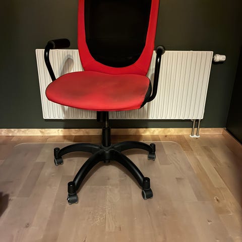 Matta och fåtölj i rött tyg med rundad sits och ryggstöd. Stolen har snurrfot i metall med fyra ben. Passar som sittplats i vardagsrum, sovrum eller kontor.