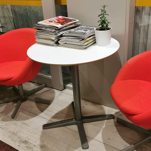 Kamfåtöljer i svart tyg och fåtöljer i rött tyg med snurrfot