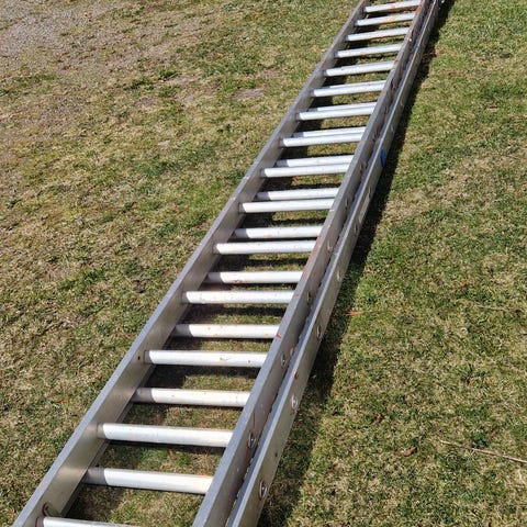 Zarges 3-delad utskjutsstege i aluminium. Stegen har 20 stegpinnar per del och en maximal arbetshöjd på 15,08 meter. Modellnummer 40443.