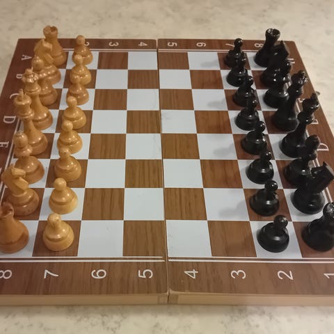 Schackspel med hopfällbart schackbräde i trä och kompletta schackpjäser i två färger. Brädet har koordinater markerade längs kanterna och fungerar även som förvaring för pjäserna vid transport och förvaring. Pjäserna är i trä i ljus och mörk färg, med olika höjd för bonde och kung enligt standardutförande. Lämpligt för hemmabruk och fritidsspel.