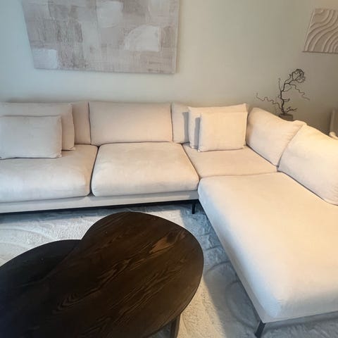 Säljer soffan Rossita 4-sits Vänstervänd L-formad Djup Schäslongsoffa i tyg efter en felbeställning. Den har matchande prydnadskuddar som ingår. Den är helt ny och några dagar gammal bara.
