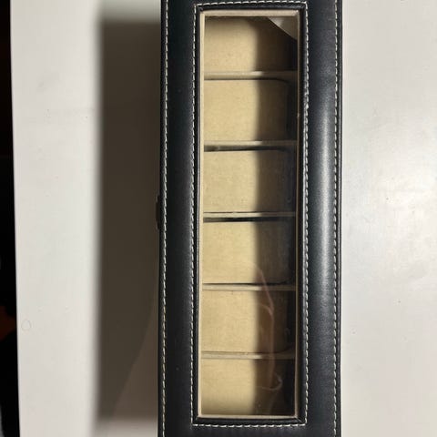 & Other Stories smyckeslåda med glaslock och 10 fack. Lådan har trämönstrad utsida i mörka och ljusa toner samt ett genomskinligt lock som gör innehållet synligt. Invändigt finns 10 separata fack med ljusa kuddar som lämpar sig för förvaring av klockor eller armband. Passar för organiserad förvaring av smycken i hemmet.