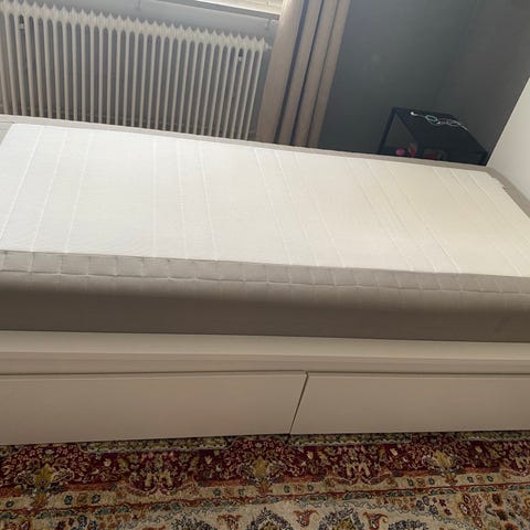 IKEA sängstomme med förvaring i vit färg. Stommen har inbyggda utdragslådor under liggytan som ger extra förvaringsutrymme för till exempel sängkläder, kläder eller andra textilier. Konstruktionen består av en sängram i träbaserat material med slät vit yta. Passar som enkelsäng i sovrum, gästrum eller barnrum.