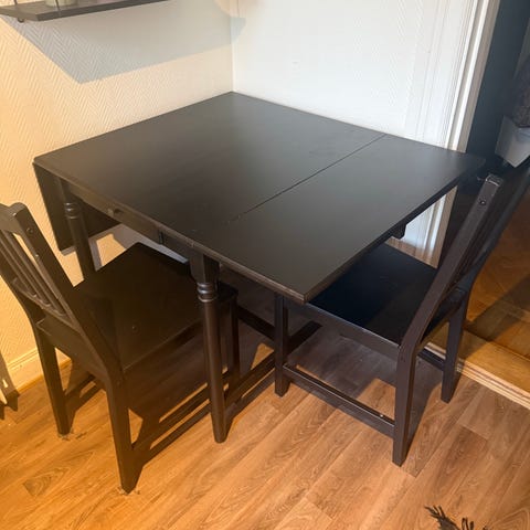 Snyggt och praktiskt matbord med två matchande stolar. Perfekt för kök, mindre lägenhet eller som frukosthörna. Bordet är stabilt, lätt att hålla rent och har en modern, ljus träfinish. Stolarna har bekväma sitsar och passar perfekt till bordet.