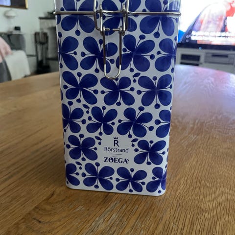 Rörstrand Zoégas burk i blåvitt mönster. Rektangulär plåtburk med lock och metallspänne. Passar för förvaring av kaffe eller annat torrt livsmedel i kök. Dekor med blå blommönster runt om och Zoégas-tryck på lock och framsida.