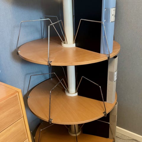 Hörnhylla i ljus fanér. Hyllan är utformad för att stå i ett hörn och har justerbara hyllplan.Passar för förvaring av böcker, prydnader eller annan mindre förvaring i vardagsrum, sovrum eller hall.