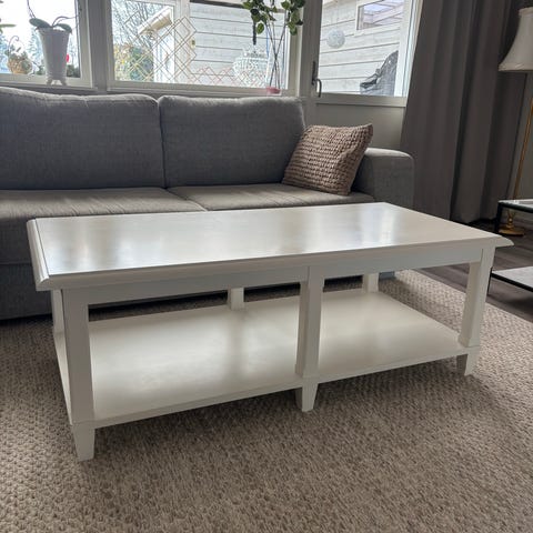 Säljer ett vitt soffbord i stilren och tidlös design. Bordet passar perfekt framför soffan och har en praktisk hylla undertill för förvaring av t.ex. tidningar eller fjärrkontroller.