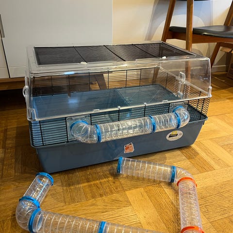 Bur i glas och metall med överdel i galler. Inredning och tillbehör för smådjur som hamster, Gerbiler eller liknande ingår, bland annat hus, gömställe och gångar i trä och plast, matskålar i keramik och metall, sand- eller badkar, transportbur i plast, löphjul i metall och vattenflaska.