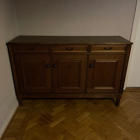 Köks-skänk i massiv ek. Tre skåp och tre lådor. Tidigt 2000-tal. Köpt på Matfors-möbler. Hämtas av köpare.