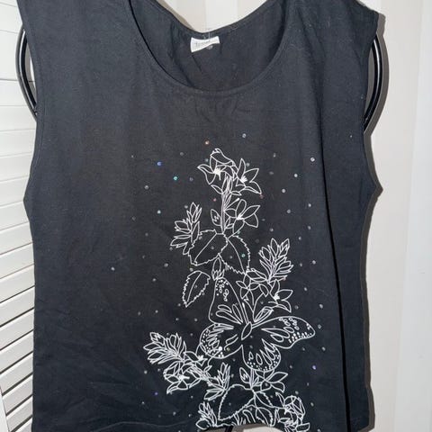 Svart topp med korta ärmar och en vacker broderad detalj runt halsringningen. Toppen har en smickrande passform och är ett mångsidigt plagg som kan bäras till vardags eller kläs upp för en finare tillställning.