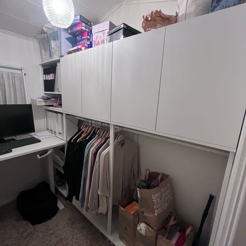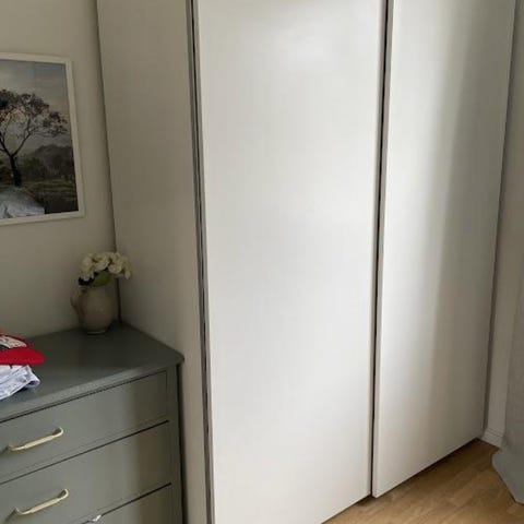 IKEA garderob Pax Hasvik med skjutdörrar och inredning med klädstång och flera lådor/hyllor för förvaring av kläder.