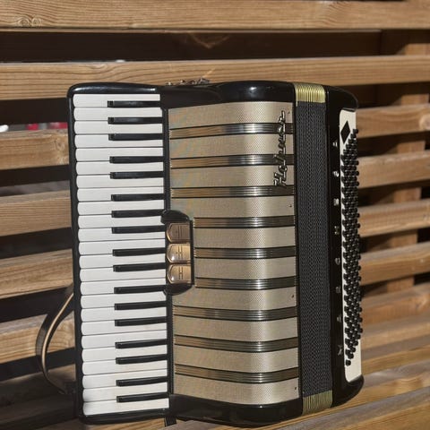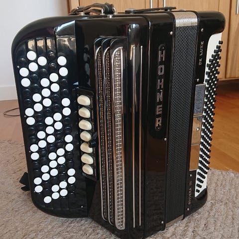 Trekörigt, violinstämt knappdragspel av det välkända märket Hohner. Fullstort med 120 basar. Fem register i diskanten och tre i basen. Vikt 9,8 kg. Mycket fint skick! Passa på att köpa ett toppinstrument till ett vettigt pris!