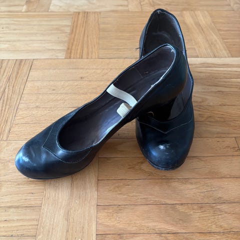 Utseende; Svarta läderskor med tå och klack i lack.