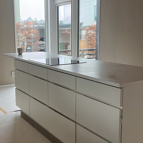 Finns tyvärr inte så mycket bilder på köksön. Men består av fin bänkskiva(samma modell som andra bänkskivan), kanter klädda med aluminiumlist, under finns 4st skåp på 60x70x35.