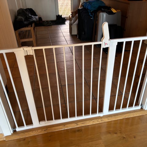 Barngrind/trappgrind i trä från Kaxholmens sängfabrik. Bredd 108 cm. Passar bra för öppning på 100 cm. Höjd 75 cm. Smidig att öppna och stänga. En traditionell trappgrind.