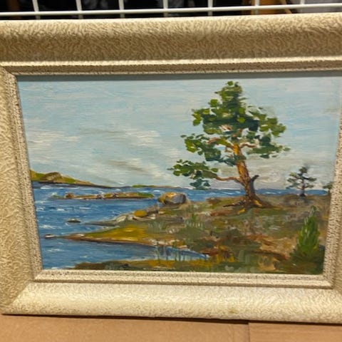 Tavla med målat landskapsmotiv föreställande sjö, båt, hus och berg i bakgrunden. Färgerna går i mjuka toner av blått, grönt, gult och brunt.
