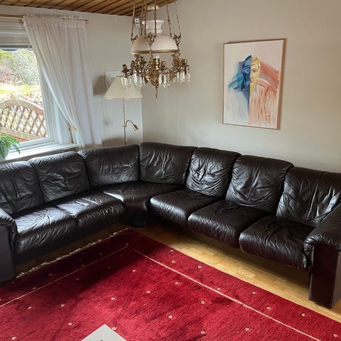 Märken i skinnet på baksidan, se bild. Samt litet märke på ena armstödet, se bild. I övrigt bra skick.