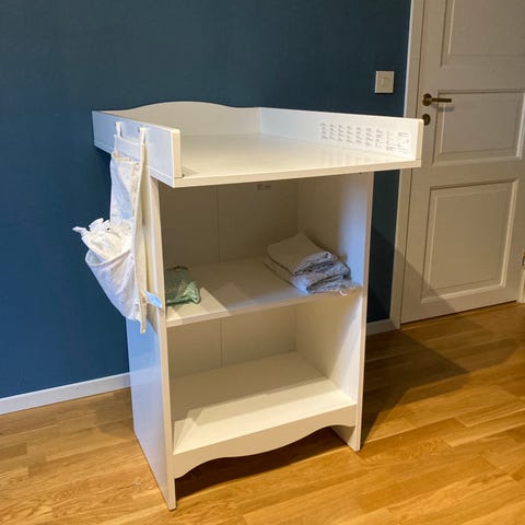 IKEA sänghimmel för barn i vit textil. Monteras på väggen ovanför sängen för att skapa en avskärmad och ombonad känsla runt barnsängen.