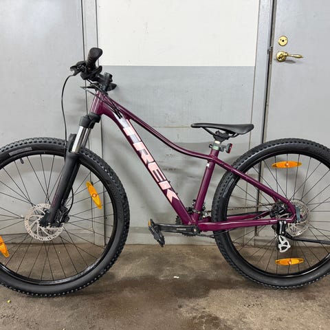 Trek Marlin 4 mountainbike i storlek S med 27,5" hjul. Cykeln är grön och utformad som unisexmodell. Utrustad med framgaffel med dämpning, raka styren och skivbromsar. Passar för vardagscykling och enklare terrängkörning. Cykeln har förvarats inomhus.