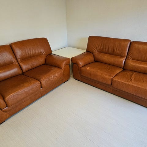 Soffan har några år på nacken och har lite slitningar i skinnet men inga hål.