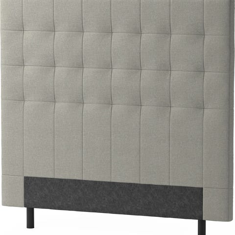 IKEA sänggavel i beige textil för säng, bredd ca 140 cm. Klädd, vadderad gavel med rutquiltad framsida. Raka, mjukt rundade kanter. Monteras bakom sängen mot väggen eller på sängram enligt anvisningar. Passar som ryggstöd vid läsning eller vila i sängen och ger ett enhetligt avslut på sängplatsen.