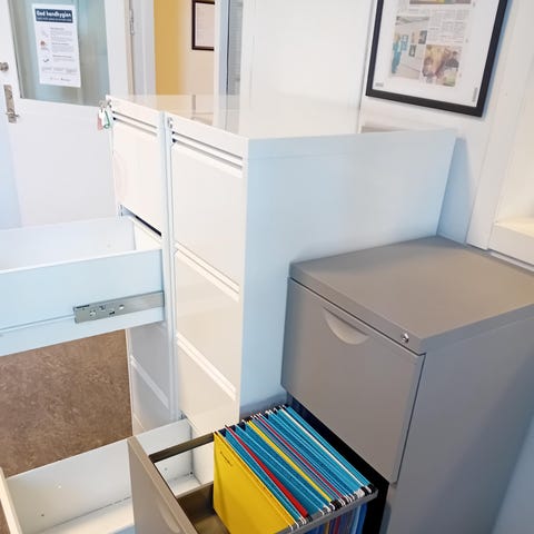 Kontorsmöbel i svart utförande bestående av skrivbord, hurts och hylla/skåp. Skrivbordet har L‑formad bordsskiva med plats för dator och arbetsmaterial. Hurtsen har utdragbar låda anpassad för hängmappar samt kombinationslås på ovansidan. Hyllan har öppna hyllplan upptill och skjutdörrar nertill för dold förvaring. Passar för kontor, arbetsrum eller studieplats.