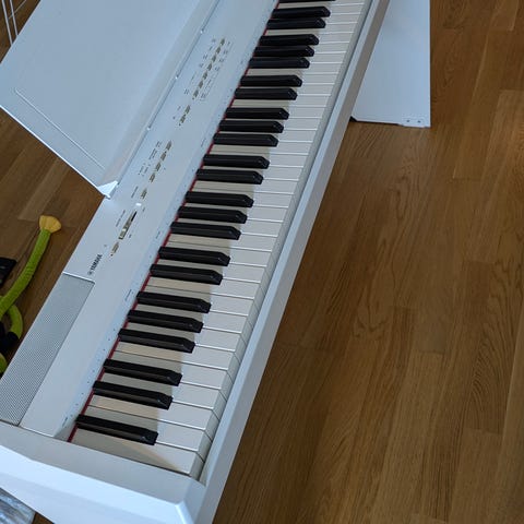 Yamaha P-255 digitalpiano i vitt utförande. Modellen har fullt klaviatur med 88 tangenter och inbyggda högtalare. Pianot är utrustat med digitala funktioner som olika ljudlägen och inställningar via kontrollpanelen ovanför tangenterna. Stativ och pedal ingår enligt bilderna.