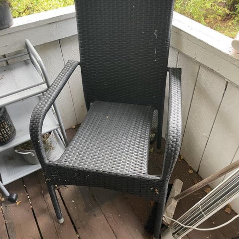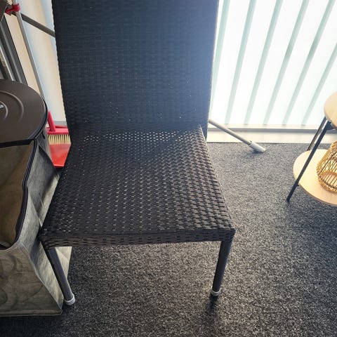 Trädgårdsfåtölj i svart konstrotting med armstöd och rak rygg. Stolen har en lös sittdyna i mörk färg för ökad sittkomfort. Passar för användning på uteplats, balkong eller i trädgård. Ram och ben är i samma flätade konstrottingmaterial för en enhetlig design.