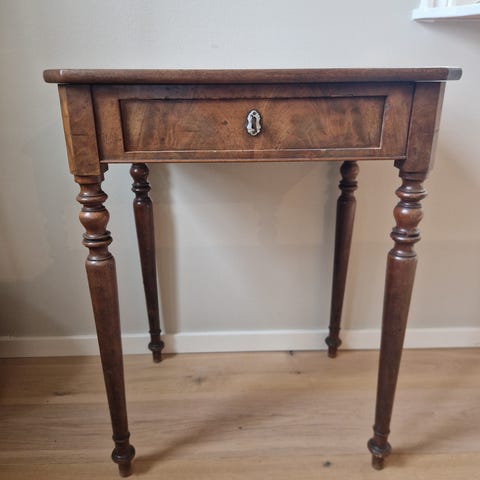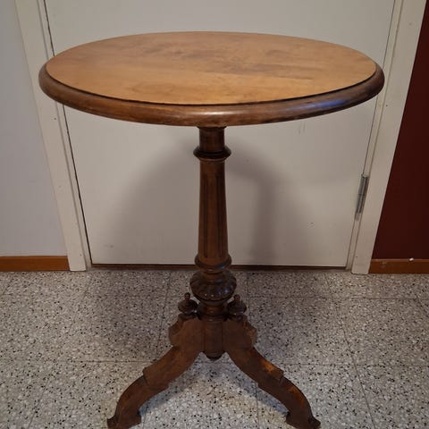 Antikt pelarbord/sidobord i trä. Ovalt formad. Bordsskivan 57 x 39 cm. Höjd 74 cm. Fint bruksskick.