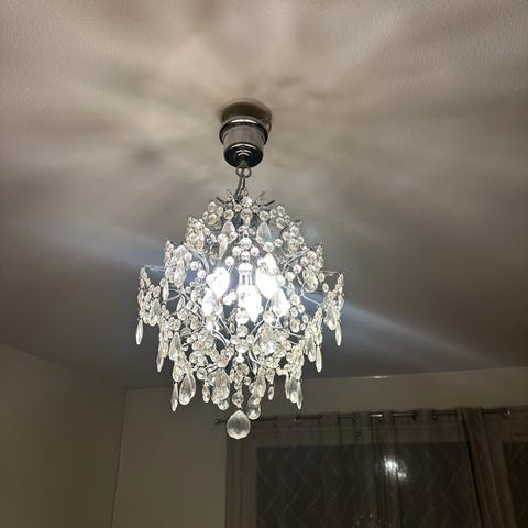 Säljer en vacker fjäderlampa som ger ett mjukt och behagligt ljus i rummet. Lampan har en stilren vit design med lager av fjädrar som skapar en mysig och elegant känsla, perfekt i sovrum, barnrum eller vardagsrum.