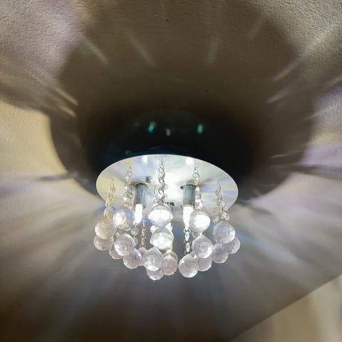 Lampan är väldigt lätt och hänger i en vit sladd från taket. Den sprider ett varmt och stämningsfullt ljus som gör rummet extra ombonat.