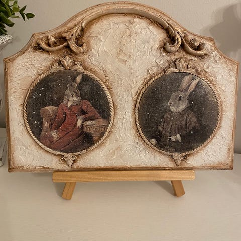 2 st stört söta kaniner i trä , dekorerade med vackert mint grönt/ lila rosa papper samt lila prickigt på andra sidan och med matchande rosett 💜🩷💜💚 finns bara dessa 2 💕