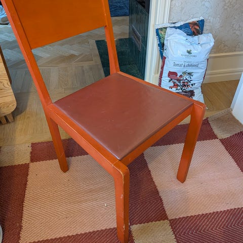 Rottingen är mer eller mindre trasig i överkant, se bild. Vissa stolar är lite vingliga, kan säkert dras åt med skruvarna undertill.