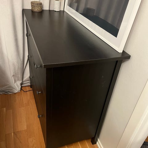IKEA byrå i svart utförande med totalt åtta lådor, fyra mindre överst och fyra större nedtill. Byrån är fristående med plan ovansida som kan användas som avställningsyta. Passar för förvaring av kläder, textilier eller andra hushållssaker i sovrum, vardagsrum eller hall.