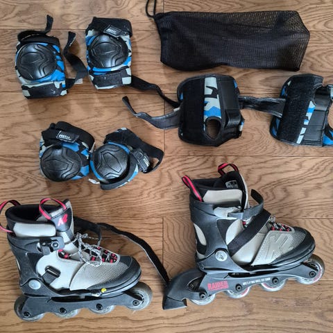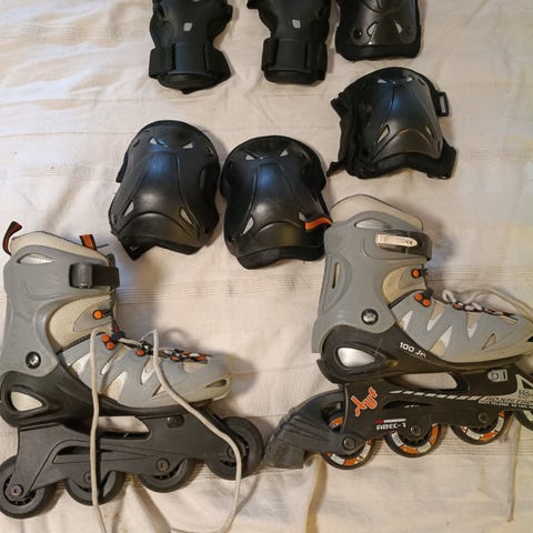 Salomon rullskidpaket med pjäxor i storlek 42 i svart färg. Paketet innehåller rullskidor, Salomon pjäxor anpassade för rullskidåkning, skate & klassiskt , stavar 140cm samt skyddsutrustning för knän och armbågar.