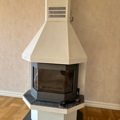 Öppen spis/kamin i vit färg med glaslucka framtill. Placeras mot vägg och är utformad med vinklad front för bättre insyn i elden. Skorsten ingår inte!