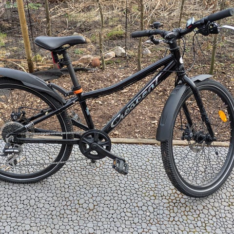 Scott barncykel med 24" hjul. Cykeln har röd ram med svart sadel och styre. Utrustad med framgaffel med dämpning, fot- och handbromsar samt reflexer på hjulen. Passar barn som vuxit ur mindre barncyklar och behöver en större cykel med 24-tums hjul för vardagscykling och enklare turer på grusväg och stig.