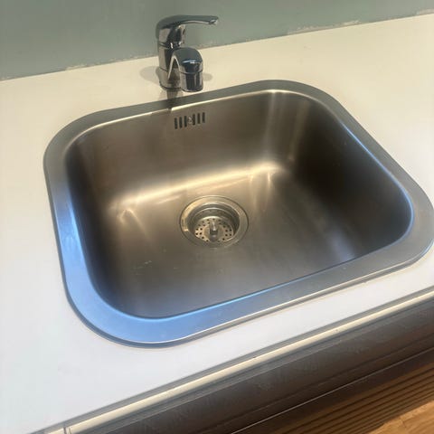 Rostfri diskbänk med dubbelho och köksblandare. Bänken har två separata hoar med avlopp och sil. Integrerad arbetsyta i rostfritt stål ger en sammanhängande yta för disk och matförberedelse. Passar för montering ovanpå köksskåp i standardhöjd i kök eller grovkök.