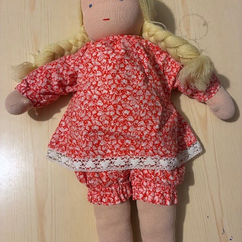 En söt Waldorfdocka, handgjord och stoppad med ull. Hon älskar att bli gosad, och hon har några skavanker. Men hon är fortfarande helt intakt.