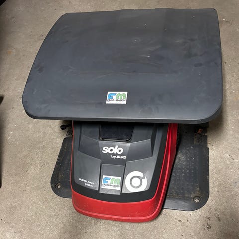 Solo by AL-KO robotgräsklippare i svart och röd färg. Enheten står på sin laddstation/dockningsstation. Robotgräsklipparen är avsedd för automatisk klippning av gräsmatta och återvänder till laddstationen när batteriet behöver laddas. Passar för trädgårdar där man vill ha regelbunden och jämn klippning utan manuell insats.