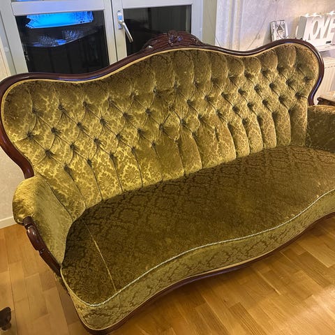 Soffa i 3-sitsmodell klädd i guldfärgad sammetstextil. Ryggstödet har dekorativt mönster med lodräta sömmar och lätt rundad form. Sitsen är mjukt rundad framtill och armstöden är låga och svagt svängda. Passar som sittmöbel i vardagsrum eller liknande utrymme.