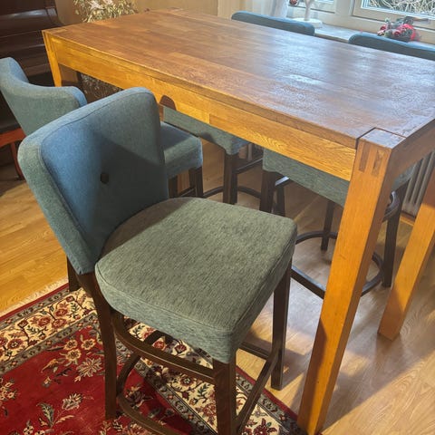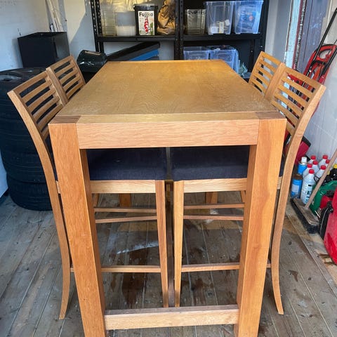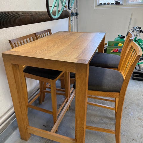 Säljer ett snyggt och gediget barbord tillsammans med fyra barstolar. Perfekt för kök, det tillverkad från AZ Design