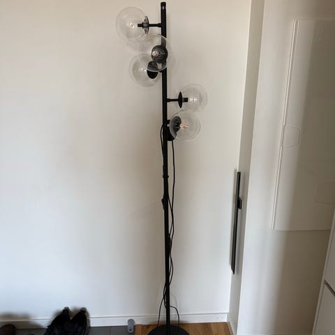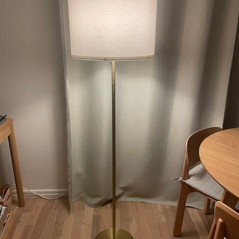 Golv lampa med ljuskälla svart guld lampskärm höjd 86 cm och 45 cm i diameter 150 kr.