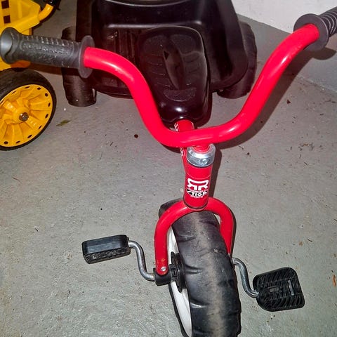 Barncykel trehjuling i röd färg. Cykeln har tre hjul med plastfälgar, pedaler på framhjulet och ett större plastflak baktill för last eller leksaker. Lämplig för mindre barn som vill träna balans och tramprörelse på en stabil trehjuling.