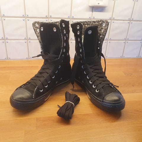 Converse Chuck Taylor All Star sneakers i storlek 39. Modellen är unisex och i hög variant med ovandel i vit textil. Yttersula i gummi med klassiskt mönster för grepp. Skorna har snörning framtill, Converse All Star-logga på sidan och förstärkt tåparti. Passar som vardagssko och fritidssko.